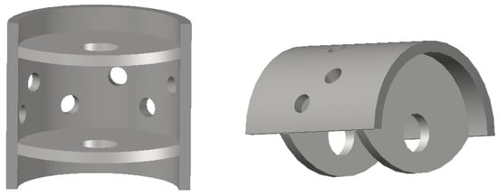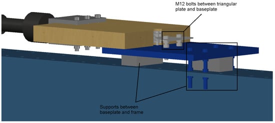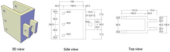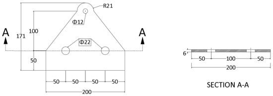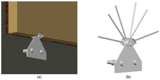 To facilitate the adaptation of RADIAL for external applications, a 6 mm thick plate was designed in accordance with Eurocode 3 [] to connect it securely to the RC structural element, as depicted in Figure 4. The dimensions are specified in mm and the plate material is classified as S275 according to EN10025-2 [].