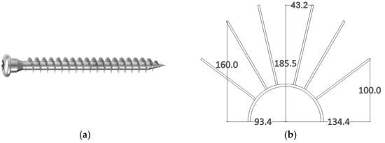 The RADIAL connector can be attached to the CLT edge using up to six LBS 7x160 mm screws oriented variably (see Figure 3a). The positions of these six screws in RADIAL relative to the connector center are illustrated in Figure 3b in mm.