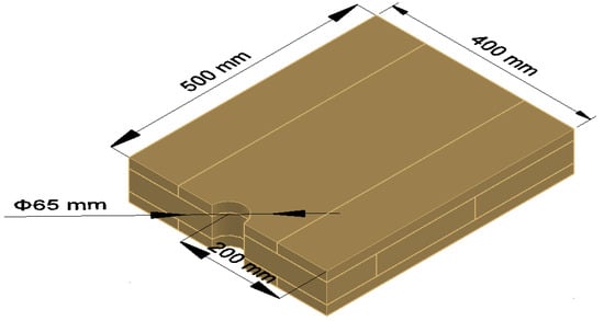 Each board in the panel had a width of 140 mm. The panels had plan dimensions of 500 mm in the direction of the external lamellas and 400 mm in its perpendicular direction. Tensile loads were applied parallel to the direction of the external lamellas. To accommodate the semicircular plate of the RADIAL connector, which had an external diameter of 62 mm, each panel was cut into a half-circle with a diameter of 65 mm, as depicted in Figure 5.