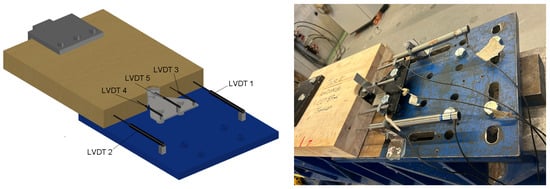 As depicted in Figure 9, five linear variable differential transformers (LVDTs) were incorporated into the tests. Two of these (LVDTs 1 and 2), affixed to the steel baseplate with a capacity of 50 mm, measured the global displacement of the CLT. Another two (LVDTs 3 and 4), fixed on the plate with a capacity of 10 mm, measured the relative displacement between the TP and the CLT panel. The last one (LVDT 5), situated in the middle and attached to the plate with a capacity of 10 mm, monitored the relative displacement between RADIAL and the TP.