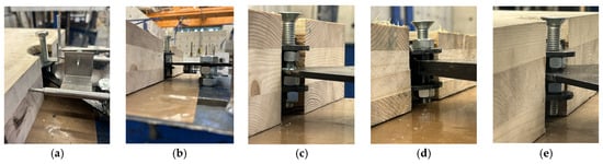 The test setup shown in Figure 7 was designed to simulate the tensile performance of an infilled RC building connected to a CLT shear wall through the proposed connection. The specimen was secured to the frame using four M20 bolts. Additionally, supports as shown in the figure were included to prevent out-of-plane deformations. As already described, two M20 bolts were used to fasten the TP to the baseplate. This configuration aims to avoid any potential bending of the bolts and to distribute any concentrated damage around the RADIAL.