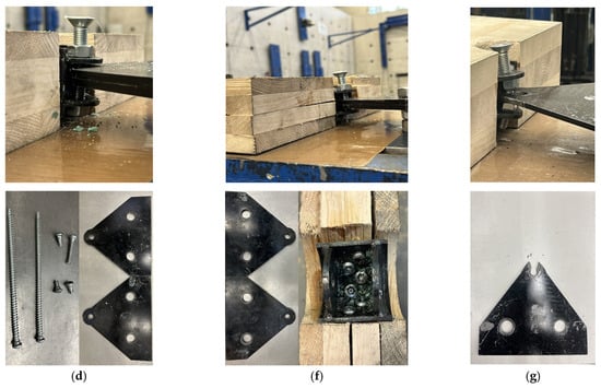 Failure modes observed in the tests performed: (a) Bending of grade 8.8 bolt, (b) Shear of TP, (c) Shear of TP, (d) Thread withdrawal of screws, (e) Bending of grade 10.9 bolt, (f) CLT delamination, (g) Shear of TP.