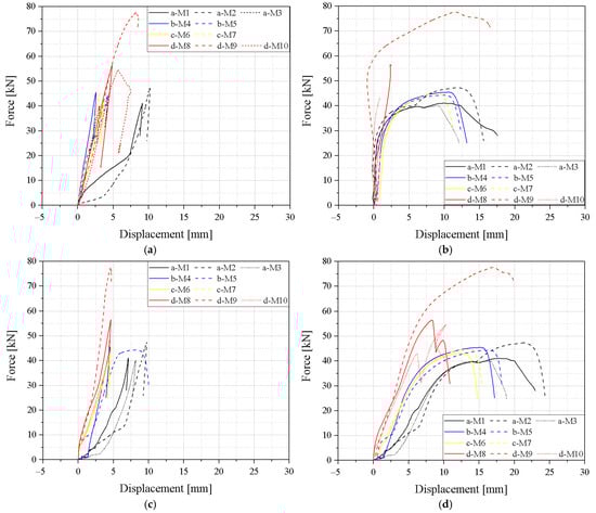 Figure 12 shows the load–deformation capacity of the connection. Initial slips occurred in the setup during loading due to adjustments of the connectors or loosened bolts and screws. These slips were removed from the curves.