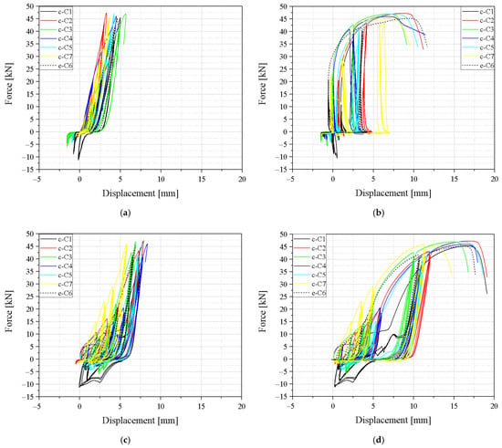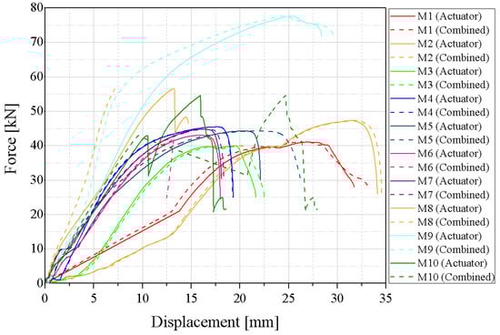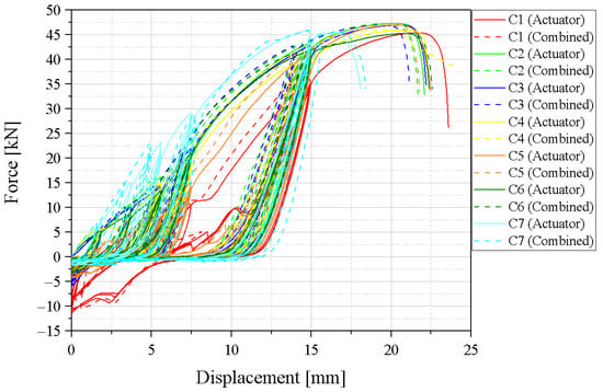 Force–displacement curves registered by the actuator and the combined displacement from Equation (7) in cyclic tests.