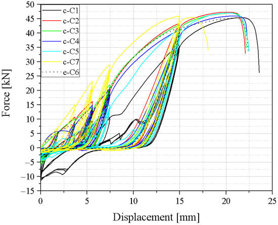 The strength impairment, observed in triple cycles (e.g., 3, 4, 5), represents the loss of strength from the first to the third cycle as a percentage of the strength in the initial cycle according to EN 12512 [], as provided in Table 7 for the triple cycles with peak displacements of 0.75 Vy, Vy, and 2 Vy. It is directly linked to stiffness degradation. It is normally measured for both positive and negative cycles, but here only positive cycles are considered, taking into account the tensile test being loaded in only one direction. It is shown that the mean (12.41 kN, 6.69 kN, and 6.34 kN) and variation (44%, 43%, and 19%) of this strength from the first triple to the last one were decreasing. Also, C6 presents the least strength impairment compared to the others, possibly due to adopting the least number of nuts added to the M12 bolt (two nuts).