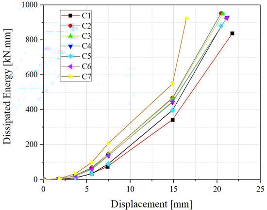 The next important characteristic extracted from a cyclic analysis is energy dissipation, which is measured as the area enclosed in the cyclic curves as defined by code EN 12512 []. The accumulated dissipated energy of each test is shown versus the displacement of the panel (average displacement of LVDTs 1 and 2) in Figure 18. Except for the curve for C7, the variation in the remaining curves is small. In this test, six screws were used to connect RADIAL to CLT, and the M12 was fully equipped with nuts. In the rest, either four or five screws were adopted, or the nuts were not fully added to the bolt, indicating that the fasteners played an important role in dissipating energy.