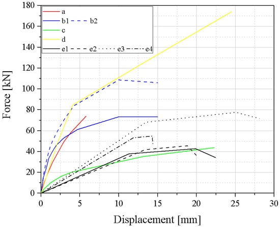 To better understand the tensile behavior of RIC across the various failure modes listed in Table 3, and to compare these with other connection systems developed for joining RC to CLT, it is essential to analyze their force–displacement curves. Figure 19 presents five RC-CLT connections: (a) Iztok I [], (b) Iztok II [], (c) angle bracket [], (d) X-RAD [], and (e) RIC. Figure 20 illustrates their tensile performance, each based on different testing campaigns. In this figure, b1 and b2 represent the Iztok II connection using bolt classes 4.6 and 8.8, respectively. Additionally, e1 through e4 correspond to the RIC connector with failure modes 1 to 4, as specified in Table 3.