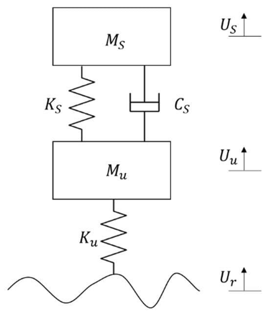 In this research, a simple two-degree-of-freedom (2-DOF) model was constructed comprising sprung and unsprung masses traversing a random roughness profile, as shown in Figure 1. The sprung mass emulates a quarter of the vehicle’s body, whereas the unsprung mass represents the wheel of the vehicle. The QC model is commonly used to analyze the dynamic characteristics of a vehicle [,]. This model was chosen for its straightforwardness and to reduce the computational resources required for implementing this approach. The random roughness profiles were generated following the guidelines of the ISO 8608 standard []. The equations governing the 2-DOF model are described in Equations (1) and (2) []: