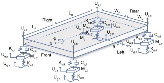 In this study, a more intricate seven-degree-of-freedom (7-DOF) full-car model was developed. The FC model comprises four unsprung masses representing the vehicle’s wheels and a single sprung mass representing the vehicle’s body along with the pitch and roll dynamics, as illustrated in Figure 2. The governing equations for the FC model are condensed in Equations (4)–(18) []: