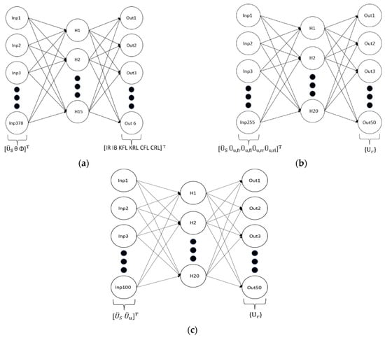 ANN architecture for (a) FC model characterization, (b) FC road roughness reconstruction, (c) QC road roughness reconstruction.