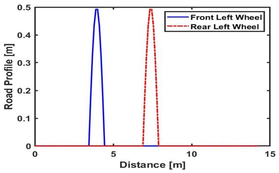 This study involved generating different road roughness profiles. The road profiles consisted of 50 (randomly selected) data points for both the FC and QC road roughness ANNs. A total of 2000 random roughness profiles were generated for each road roughness class, spanning the A–H classifications. Additionally, a speed bump profile was generated for the FC modal characterization ANN (ANN-FC-M). The speed bump profile was defined by a length of 1 m and a height of 0.5 m, as shown in Figure 4.