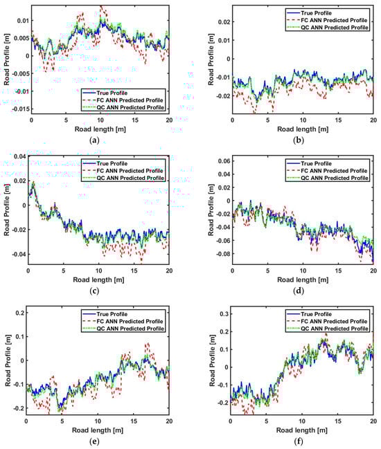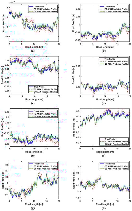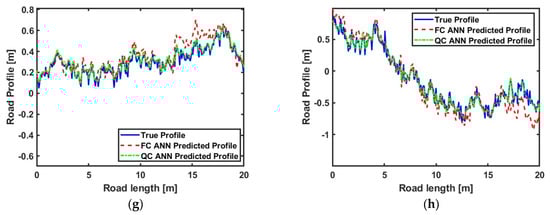 Figure 6 summarizes the eight roughness classification testing profiles and demonstrates how FC- and QC-trained ANNs reconstructed those roughness profiles. Figure 6a–h illustrate the road roughness classes A–H, respectively. Across the figures, the QC-trained ANNs (shown in dashed green) better reconstructed true road roughness profiles compared to the FC-trained ANNs. This outcome may be due to the simplicity of both the QC numerical model and its corresponding ANN. A noticeable decrease in the accuracy of the FC-trained ANNs occurred when the roughness level increased. The regression of the FC estimated profile for class A was 0.98896, while its regression in estimating a class H road roughness profile dropped to 0.95298. The computational time of the FC-trained ANNs increased with the roughness of the road profile, while the QC-trained ANNs were unaffected by the varying roughness levels. Overall, both QC- and FC-trained ANNs showed good accuracy in reconstructing the road roughness profiles.