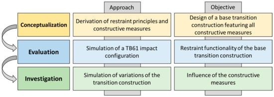 The approach to evaluating the restraint potential of constructive measures (CMs) is processed in three steps (Figure 1). Based on the literature, restraint principles of existing TCs were derived, and CMs for implementing each principle in a TC were developed. A finite element (FE) model of a TC is introduced, combining models of a steel RRS and a concrete RRS validated for H3 and H4b containment levels, respectively. The TC is designed using all derived CMs. The functionality and restraint capabilities of the TC are evaluated by conducting a simulation of the certification test TB61 according to EN 1317-2 []. Furthermore, the extent to which each single constructive measure contributes to the restraint capability of the TC is analyzed by a parameter variation.