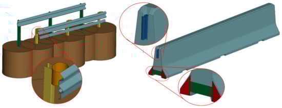 The concrete barrier was modeled with rigid solid elements (gray), as no deformation or damage was observed in the test data. The coupling and connector parts (blue) were modeled with solid elements and allocated with elastic–plastic steel material properties. The couplings on both free ends of the RRS were fixed in space to represent the start and end anchorages. In between each concrete element, two wedges (red) with elastic–plastic material properties, connected by a rubber strap (green), were positioned.