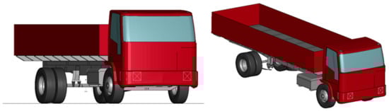 The model includes a geometrical representation and features air-filled tires, a suspended and steerable front axis, and a suspended rear axis equipped with dual tires. Despite the motor block and parts included in joints, all parts are modeled with deformable materials. Bolt connections are simplified via nodal rigid body constraints. Modifications were made to the original suspension characteristics to enable improved vehicle–barrier interaction. The major characteristics of the model are listed in Table 3.