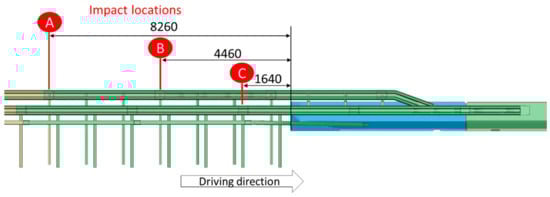 The impact locations in Figure 6 were chosen, assuming that one of them represents the most critical loading scenario for the TC. Impact locations A and B are situated on the seventh and fourth posts of the upper guardrail, which are located 8260 mm and 4460 mm before the connection element, respectively. Impact location C is situated at the second post of the lower guardrail, which is 1640 mm before the connection element.
