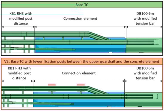 V2: Fewer fixation posts between the upper guardrail and the concrete element: By implementing CM2, the base TC included three fixation posts to connect the upper guardrail to the connection element. In this variation, the number of posts was reduced to two (Figure 8).