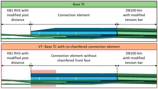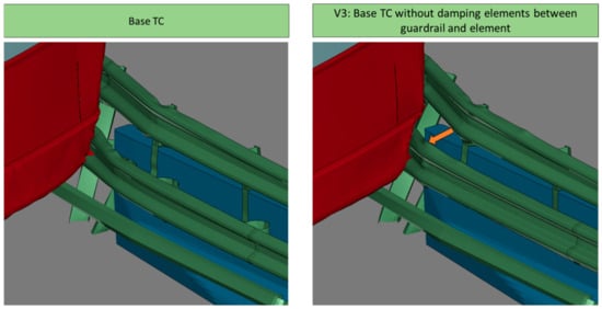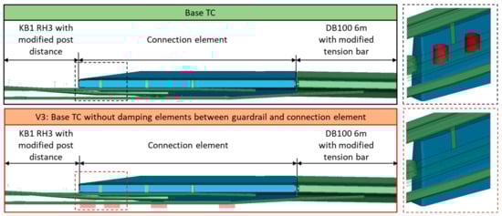 V3: No damping steel parts between the guardrail and concrete element: The damping steel parts between the connection element and the steel guardrail installed in the base TC, based on CM3, were removed in this modification (Figure 9).