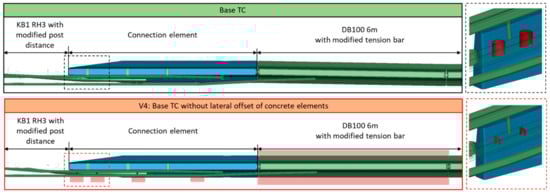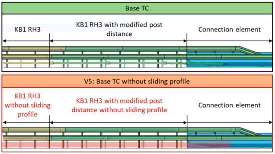 Two RRSs were chosen for this study due to their frequent use on Austrian motorways: the steel RRS KB1 RH3 from voestalpine Krems Finaltechnik GmbH and the concrete RRS DB100 6m from DELTABLOC GmbH. The steel RRS is certificated according to EN 1317-2 [] for containment level H3 with a working width of W5, and the concrete RRS for containment level H4b with a working width of W6. Both RRSs are approved for use on Austrian roads and registered by the Ministry of Transport []. These two RRSs are used as the base RRSs, which are connected by a TC. This TC is referred to as the base TC and includes the above-mentioned CMs.