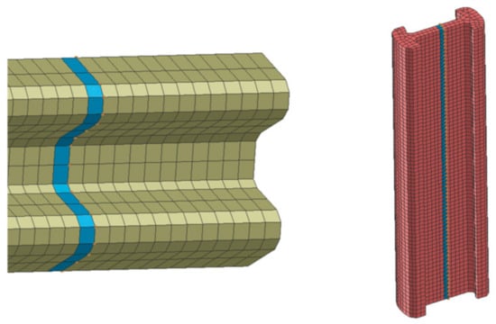 The steel RRS consists of two independent guardrails and is modeled with shell elements and elastic–plastic steel material properties. Bolt connections that link the guardrails (gray) with the damping elements (orange) and the posts (yellow/green) were simplified via beam elements with mechanical characteristics as the corresponding bolts. The posts were embedded in solid elements (brown) representing the soil. The material parameters and the modeling method for the soil were taken from the literature []. Both free ends of the RRS were fixed in space to represent the start and end anchorages.