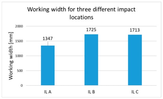The working width was mainly positively influenced by the compaction of posts (CM1) and an additional steel bar (CM5). Those CMs increase the stiffness of the steel RRS and, therefore, provide more resistance to lateral deformation. They also contribute to a smooth and monotonous increase in the stiffness of the whole TC. The geometrical modification, such as the chamfering of the first concrete element (CM7), also reduces the working width of the TC. A negative effect on working width was only documented for the lateral offset of the first concrete element (CM4). However, as the initial position of the connection element is closer to the system’s leading edge—where the working width is measured—the comparison of this CM with other variations should be interpreted with care.