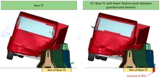 The modification of the fixation posts from three posts in the base TC (featuring CM2) to two posts in the modified TC (V2) results in a 6% increase in the working width (Figure 18, Table 4). The tensile force in the couplings increases by 6.0%, while the forces in the lower and upper guardrails increase by 6.5% and 7.1%, respectively. A contact force of 14.6 kN is detected between the front left wheel and the connection element. Considering the effect of an increased tire pressure percentage of 1.7%, an increased risk of vehicle pocketing is derived for a TC not featuring CM2.