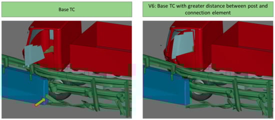 The omission of the sliding profile, which was initially implemented based on CM5, does not influence the vehicle kinematics. Only a change in the deformation of the post closest to the connection element is observed due to the direct contact of the front left wheel with the post (Figure 21). This results in an increased tire pressure of 1.1% (Table 4). In addition, contact between the wheel and the connection element is observed (3.0 kN). Nevertheless, the sliding profile contributes to the lateral resistance of the RRS, which can be seen by a 15.3% increase in working width in the modified TC. The increased deflection further leads to an increase in tensile force in the lower and upper guardrails by 22.9% and 4.7%, respectively. In addition, an increase in the coupling force is observed (8.9%).
