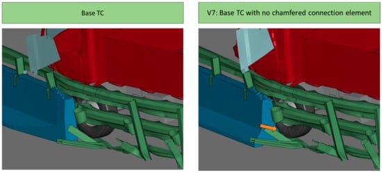 The influence of the geometry of the connection element (CM7) on the vehicle–RRS interaction can be seen in Figure 23. Without chamfering of the connection element, the left front wheel of the vehicle hits the front flat face of the connection element, leading to vehicle pocketing. This finding can be supported by a measured contact force of 52 kN, and an increase in tire pressure of 1%. With this contact occurring in the modified TC, the working width increases by 12.5% (Table 4). Furthermore, the tensile force in the lower guardrail increases by 4.1%, whereas no change is observed for the upper guardrail. An increase of 4.3% of the tensile force in the coupling is observed.