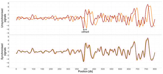 When shifting one of the two measurement signals, the shift with the minimum distance DM1|M2 can be found. This shift represents the distance in longitudinal direction by which the signal has to be moved, most of the time lying in the range of a few meters. In the upper part of Figure 1, two unsynchronised signals are shown. Those signals are then synchronised through the described process, with the result displayed in the lower part of Figure 1.