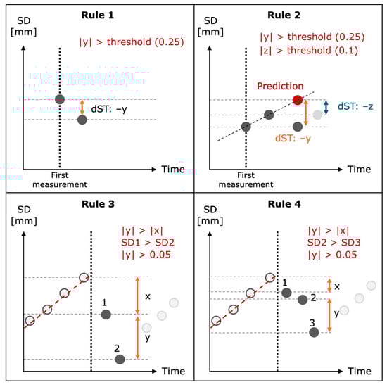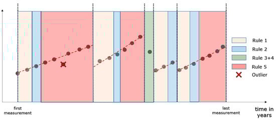 The application of Rule 1 is limited to cases where the temporary dataset comprises precisely two measurement points. In the event that the second measurement point exhibits a lower quality and a higher value than the first, no action is required, given that it is reasonable to expect a decline in track quality over time. Conversely, if the quality of the initial measurement exceeds the quality of the subsequent measurement by a defined value, a tamping action is identified. The threshold value is set at 0.25 mm, which allows for the reasonable assumption that a significant improvement can be attributed to track work and not to an issue with the data or other influences. Rule 1, like Rules 2–4, is illustrated graphically in Figure 2.