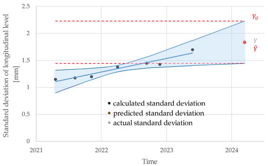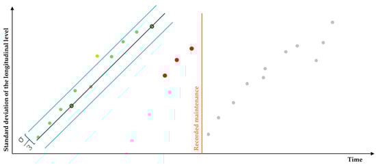 Data points that fall within the specified room and which are not part of the data set are discarded as outliers (orange points in Figure 7); those that fall outside the room (red points) are used for the subsequent determination of a deterioration branch. To prevent rooms with an excess of outliers from being erroneously designated as a segregated deterioration branch, the ratio of the time span of the identified room in relation to the labelled inliers must not exceed 1.5 times the overall inspection interval in this cross section. If no further measuring points are available for which room affiliation can be determined, the system will proceed with the next room initially defined by existing maintenance activities or the next cross-section. The procedure aims to fragment the cross-section into deterioration branches. Nonetheless, issues predominantly arise when the maintenance interval is shortened towards the end of the service life or the enhancement in the standard deviation of the longitudinal level subsequent to maintenance is minimal. Consequently, a further refinement is conducted in the second step, with the outcomes of the initial step serving as the basis for this process. In the second step, three measurement points are always employed across the room, with the first and third measurement points establishing a straight line. Subsequently, the vertical distance between the second data point and the representative point on the line is calculated, as shown in Figure 8.