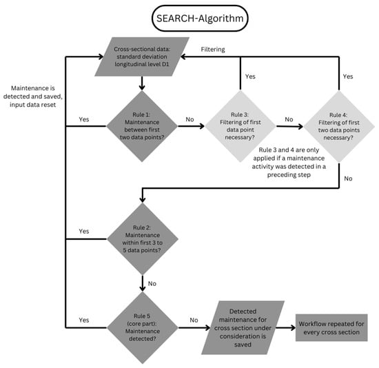 The SEARCH algorithm, first described by Fellinger [] and further developed for the aim of this comparison, can be employed to detect unrecorded tamping actions. The decision-making process is based on five conditions, all of which represent possible developments of the standard deviation of the longitudinal level D1. Moreover, the algorithm’s precision can be enhanced by incorporating recorded tamping actions.