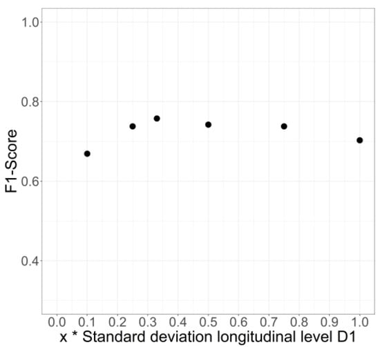 The second method provides the option of incorporating recorded maintenance data into the process, in a manner analogous to that of the SEARCH algorithm. If maintenance data is available, the period during which measurement data is available is divided into two or more rooms, with the number of rooms depending on the number of maintenance activities. In the absence of maintenance data, all measurement data is treated as pertaining to a single room. The fundamental tenets of this algorithm are derived from the core principles of the RANSAC (Random Sample Consensus) algorithm [], which is an iterative method employed to estimate the parameters of a mathematical model from a dataset that may contain outliers. The method operates by repeatedly selecting random subsets of the data, fitting a model to them, and evaluating which model has the greatest number of inliers. In this case, for each defined room bounded by maintenance actions or the beginning and end of data recording, respectively, every possible combination of two measurement points represented by the standard deviation of the longitudinal level D1 is selected iteratively. The primary objective is not to detect outliers but to identify individual deterioration branches, which occurs in two steps. In the first step, the two chosen data points establish a straight line around which an interval is traversed. The size of the interval is defined by the standard deviation of the data points in the respective room, whereby a value of 1/3 of the standard deviation has been found to be a sensible choice. Figure 6 shows that with an interval range of 1/3 (0.33) of the standard deviation of the longitudinal level D1, the highest F1 score can be reached by applying the algorithm to a calibration data set, which is further introduced in 2.3. The value by which the standard deviation of the longitudinal level D1 is multiplied is plotted on the x-axis.