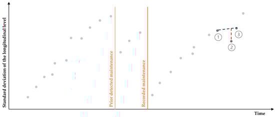 Neuhold et al.’s maintenance data was also incomplete, leading to the necessity of an algorithm to detect undocumented maintenance and renewal activities []. In their algorithm, they employ a combination of outlier detection based on data points from the modified standard deviation of the longitudinal level and a comparison of successive quality indices. They state that if the quality between two data points increases, which means that the modified standard deviation of the longitudinal level decreases and the data point cannot be classified as an outlier, then a maintenance or renewal action was executed between those two points in time.