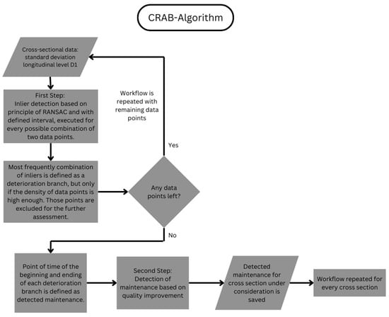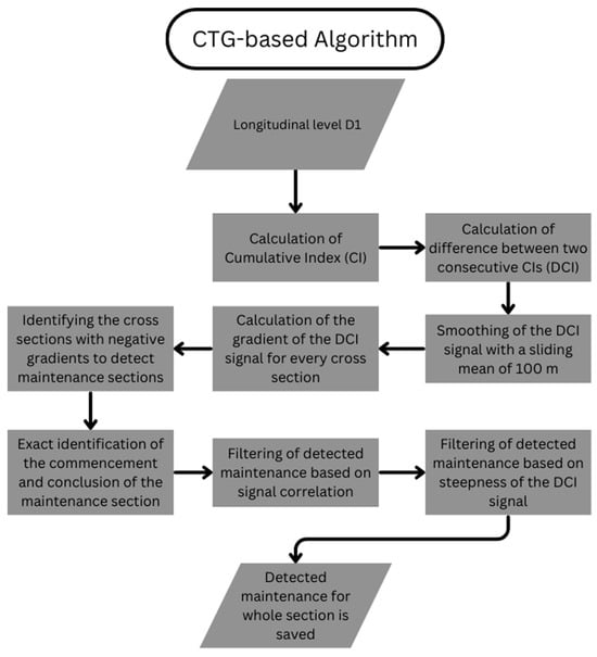 Since the performance of the CRAB algorithm and the CTG-based algorithm are decent but based on completely different principles and thus susceptible to different errors, a combination may further improve the results. In addition, recorded track work that has not been included in the evaluation of the algorithms can be considered as input variables. This improves the performance, especially for cross-section-based algorithms, as the data set is already divided in advance. The prerequisite for this is that the recorded track work data is trustworthy. Moreover, it is of paramount importance that the quality of the measurement data is of a high standard. It is of particular importance that the same measurement system, or at the very least a measurement system that is capable of reproducing the same results, is used for all measurements. Future research should address a meaningful combination of the approaches. One possibility would be to employ the CTG-based algorithm with stricter thresholds to identify a preliminary detection of the track works. Building on this, the CRAB algorithm can utilise these track works that have been detected with a high degree of probability as input parameters to achieve an even more precise result based on cross-section. Overall, the algorithms permit the identification of unrecorded maintenance activities with varying degrees of reliability. However, the specific type of maintenance performed is not currently considered. Future research may investigate whether the detected measures correspond to tamping, ballast bed cleaning, or a track renewal.