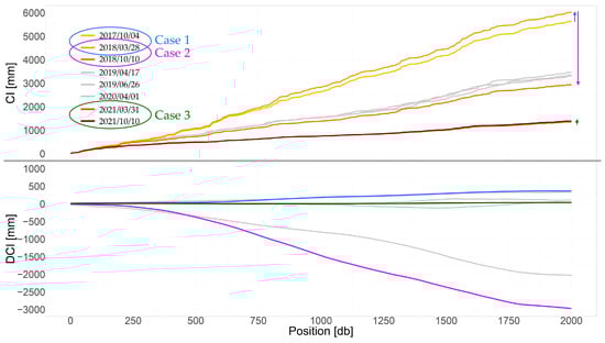 Three scenarios are presented. In Case 1, no maintenance is performed between the two measurement runs, and track geometry deteriorates at a rapid rate as the track is potentially approaching the end of its service life. This accelerated deterioration results in an increase in the amplitude of the longitudinal level, which in turn leads to a positive gradient in the DCI signal (blue). In contrast, Case 2 involves a maintenance activity between the measurement runs, which serves to reduce the longitudinal level amplitudes. Therefore, the CI signal after the maintenance has a lower gradient than the CI signal of the measurement before the maintenance. Consequently, the gradient of the DCI signal in the area where maintenance has been carried out (magenta) is negative. After a few measurement runs, which are shown in grey, a track renewal was executed. As expected, the CI signal of the first measurement run after the renewal (31 March 2021) has a flat gradient. New, undamaged components result in a minimal deterioration of track geometry and no need for maintenance. Consequently, the CI signals display gradients that are almost identical (Case 3) and flatter than the gradients in Case 1. Furthermore, the DCI signal also has a low but positive gradient.