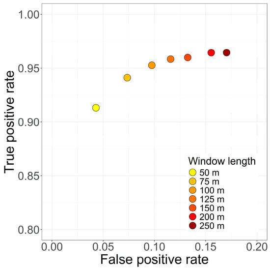 In this instance, the gradient is approximated via the secant of the DCI over a length of 100 m. The length of the secant was determined through an investigation in which secant lengths of 50 m, 75 m, 100 m, 125 m, 150 m, 200 m, and 250 m were analysed. The relation of true positive rate to false positive rate (Figure 11) reveals that a secant length of 100 m yields the best results, as then a good balance between a low false positive rate and a high true positive rate can be achieved. This analysis was conducted on four sections with comprehensive maintenance documentation, providing a ground truth that enabled the determination of the ideal secant length.