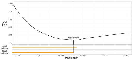 Given that the gradient of the DCI can now be described at each point using the secant gradient, the subsequent step is to ascertain in which areas the gradient of the DCI signal is negative. Given the varying gradients before and after the maxima and minima of the DCI (as depicted in Figure 12, where the gradient before the minimum is steeper than after), the selected range may be either too long or too short due to the secant length of 100 m. Accordingly, the precise location of the maxima and minima, which delineate the commencement and conclusion of the maintenance section, is subsequently determined (Figure 12).
