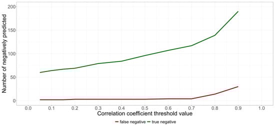 If the algorithm is cancelled at this point, maintenance measures are incorrectly assigned to an excessive number of sections. The sections are therefore subjected to a more detailed analysis in two stages. The first step is to ascertain whether the negative slope of the DCI is due to potentially incorrectly synchronised data. For this purpose, a signal correlation analysis is conducted for each identified section. The final signal preceding the identified maintenance measure must exhibit a linear correlation of at least 0.7 with one of the two preceding measurement runs. It is assumed that no further maintenance was carried out during this period. The process is then repeated with the initial measurement signal following the identified maintenance activity, comparing it to the subsequent two signals. If either the correlation value before or after maintenance is too low, the detected section should be identified as an erroneous detection and subsequently be excluded from further consideration. The threshold value of 0.7 was determined using the same data set as the influence length and is based on the interpretation of Figure 13. It was ensured that the ratio of true negatives (correctly labelled as a section without maintenance; green curve in Figure 13) to false negatives (incorrectly labelled as a section without maintenance; red curve in Figure 13) is high and that the number of false negatives is low, so that the precision of the filtering is high. These requirements are best met by a correlation coefficient of 0.7, as the number of false negatives is small up to this point and increases sharply thereafter (red curve).