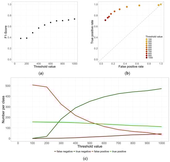 Determination of the threshold value (a) F1 score; (b) ROC curve; (c) Number of maintenance sections per class as a function of the threshold value.
