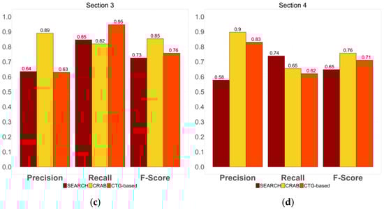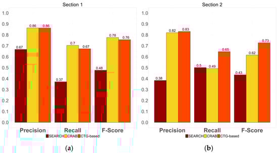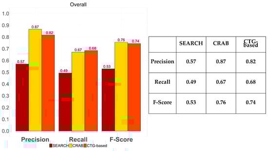 When all sections are considered together, a similar picture emerges (Figure 17). The performance of the CRAB algorithm is the best, closely followed by the cumulative track geometry-based algorithm (CTG, shown in orange). The SEARCH algorithm performs worst, achieving an F-score of just 0.53. The other two algorithms achieve an F-score of 0.74 and 0.76, respectively, whereby they differ primarily in terms of precision.