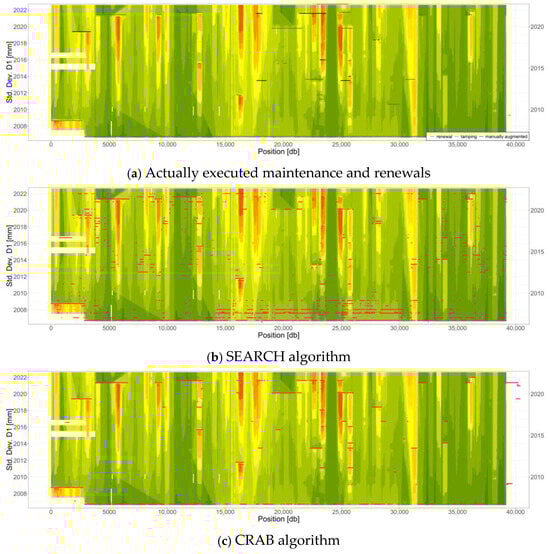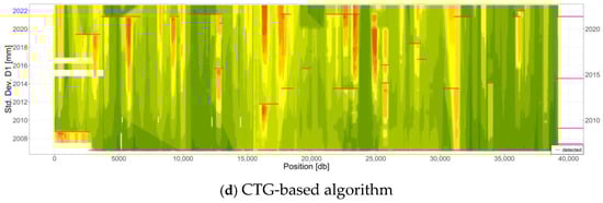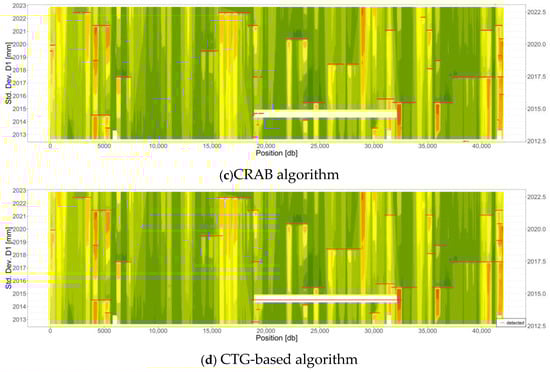 Given the suboptimal performance of the CRAB algorithm in Section 2, it is reasonable to devote further attention to this section. Figure 18a illustrates the maintenance procedures that were actually carried out in Section 2 as grey horizontal lines. Furthermore, the maintenance tasks identified by the three algorithms are displayed in the heat maps in Figure 18b–d as horizontal lines in magenta. The colours of the heat map represent the magnitude of the standard deviation of the longitudinal level D1 with an influence length of 100 m. As time progresses, the standard deviation of the longitudinal level D1 increases as track quality decreases. Following a tamping process, the standard deviation of the longitudinal level D1 exhibits a sudden drop, resulting in a colour shift in the heat map. The low recall rate of the CRAB algorithm can be attributed primarily to the fact that the algorithm only recognizes the continuous tamping measure in 2007 in specific sections. This is attributable to the slight enhancement in track geometry resulting from the tamping process, coupled with low deterioration rates after the tamping operation. This is where the most significant issue with the CRAB algorithm becomes evident: In cases where deterioration rates are constantly flat, it is not possible to differentiate between deterioration branches, given that minor changes in quality result in data points from multiple branches being classified as inliers. Consequently, it is not possible to distinguish between the deterioration areas. Therefore, especially for low-deterioration sections, the performance would be improved if executed maintenance and renewal recordings would be included. Nevertheless, for comparing the algorithms, no recordings are considered. As can be observed, the CRAB algorithm also incorrectly identifies individual cross-sections and short sections with a detected maintenance action (Figure 18c). In contrast, the CTG-based algorithm provides a more uniform representation of the identified maintenance (Figure 18d). However, three major maintenance sections between data breaks 18,000 and 27,000 are not detected at all. In this section, the SEARCH algorithm primarily encounters difficulties in correctly detecting maintenance work at the beginning of the time series, which can be seen from the large number of erroneously detected track works from 2007 to 2010 (Figure 18b). Furthermore, in many isolated cross sections, maintenance is detected erroneously. This in turn resembles a very non-homogeneous and implausible picture of maintenance.