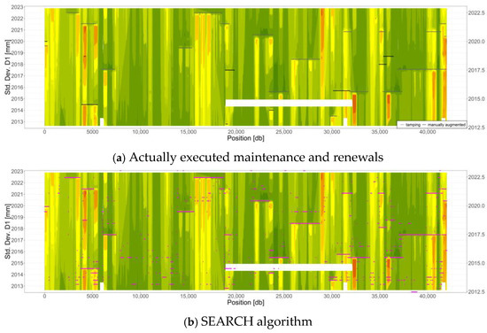 In contrast, Caetano et al. state that in their research a model for detecting changes in geometry parameters, which is not further described, is used []. Furthermore, the predictive maintenance model established is based on fixed 200 m sections, which only permit the identification of the occurrence of a maintenance activity within the section, but not its precise location. Audley and Andrews also coped with incomplete maintenance and renewal records that did not meet the requirements necessary for developing track degradation models []. Consequently, they employed an algorithm to ascertain the precise date of maintenance and renewal activities, not merely the correct year. The algorithm combines existing maintenance and renewal records with track measurement data, thereby enabling the precise determination of the time at which the measure was undertaken within a 220-yard section.