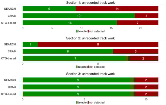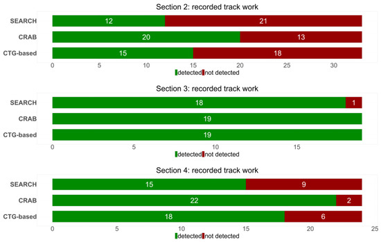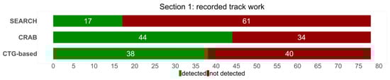 Nevertheless, it would be erroneous to consider the detection of recorded maintenance actions as the primary objective. Indeed, it is more prudent to concentrate on unrecorded track works. As illustrated in Figure 21, the number of unrecorded track works exhibits considerable variability across the sections. Nevertheless, the CRAB algorithm can be employed to identify the majority of unrecorded track works in each section, thereby enhancing the informative value of the existing database. The CTG-based algorithm demonstrates comparable performance. Furthermore, the SEARCH algorithm is also ranked last in this evaluation, as there is no section in which the SEARCH algorithm detects more track works than the other two algorithms.