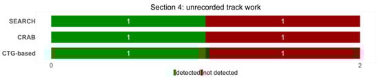 In order to transform the aforementioned findings into quantifiable data, it is necessary to ascertain whether the maintenance work recorded in each maintenance section can be accurately identified by the algorithm. An actual executed activity is deemed to be detected if track work is identified in at least 50% of the cross-sections within the maintenance section. The outcome of this assessment is presented in Figure 20, which illustrates the results for all algorithms and sections. In the first step, only the maintenance sections that were also part of the infrastructure manager’s database are evaluated. This demonstrates that the CRAB algorithm effectively identifies the majority of track work in sections 3 (all sections detected) and 4 (22 of 24 sections detected), while the result in sections 1 (44 of 78 sections detected) and 2 (20 of 22 sections detected) is less optimal. Therefore, a further examination of Section 2 is conducted to ascertain how this outcome was attained: While the CRAB algorithm correctly identifies all evident track works, as described by Figure 19, numerous short track works are not discerned. Nevertheless, these are incorporated into Figure 20, irrespective of their length. This results in a considerable number of undetected track work sections. In comparison to the CRAB algorithm, the CTG-based algorithm is unable to identify a greater number of track works in any given section. However, across all sections, the CTG-based algorithm is still more effective than the SEARCH algorithm in detecting recorded track works. Once more, the significant discrepancy between Sections 2 and 3 is evident. The CTG-based algorithm identifies all track works in Section 3 in a manner analogous to the CRAB algorithm. The SEARCH algorithm misses one of 19 sections. In Section 2, however, both the SEARCH algorithm and the CTG-based algorithm are incapable of detecting more than half of the recorded track works. This is also due to the aforementioned numerous short track works in Section 2.