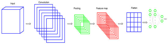 Convolutional Neural Networks (CNNs) [,] are a special deep-learning model developed to process grid data. CNNs work by automatically learning data features through multiple layers. The convolution layer is the foundation of CNNs. It works by sliding a filter across the entire input image and calculating the convolution between the filter and the corresponding sub-data region []. This process helps extract local features []. The formula for calculating the convolution of a filter W over a portion of input data X is [,,]
