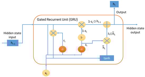 GRUs is a powerful and efficient architecture for processing time-series data. With a simple yet effective structure, GRUs not only solve the problem of vanishing gradients well but also help the model learn long-term dependencies in the data series []. The architecture of GRUs is shown in Figure 2 [].
