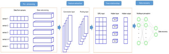 First, in the preprocessing stage, sensor data are collected and restructured into a suitable format for input into the network. Specifically, one-dimensional time-series data are restructured into two-dimensional data (adding more dimensions to the data, where one dimension is data and the other dimension is 1). Features from the raw data are prepared for training the CNN-GRU model. Next, the data are passed through the convolution layer in the feature extraction stage to extract essential features. The data are then forwarded to the pooling layer to reduce its size while retaining essential information. After that, in the time relationship stage, the data are passed through the GRU layers, where the network learns temporal relationships from the sensor data through hidden layers. Finally, the data are processed by a multilayer perceptron to predict and recover the data from the faulty sensors.