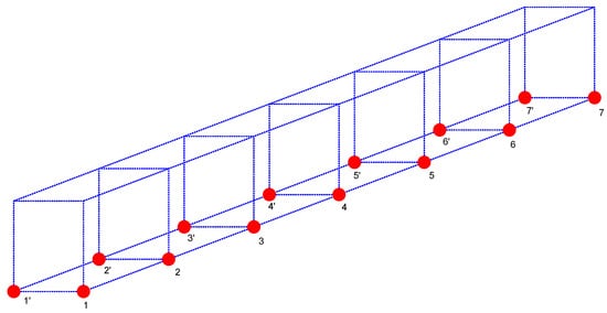 During the assessment campaign for the renovation of the Thang Long Bridge in 2020 [], a vibration survey of the bridge was conducted. Vibration data were collected at the lower truss nodes of the first span of the Thang Long Bridge. The layout of the vibration measurement points is shown in Figure 5. The objective of the survey was to identify the mode shapes and their corresponding frequencies to assess the bridge’s condition.
