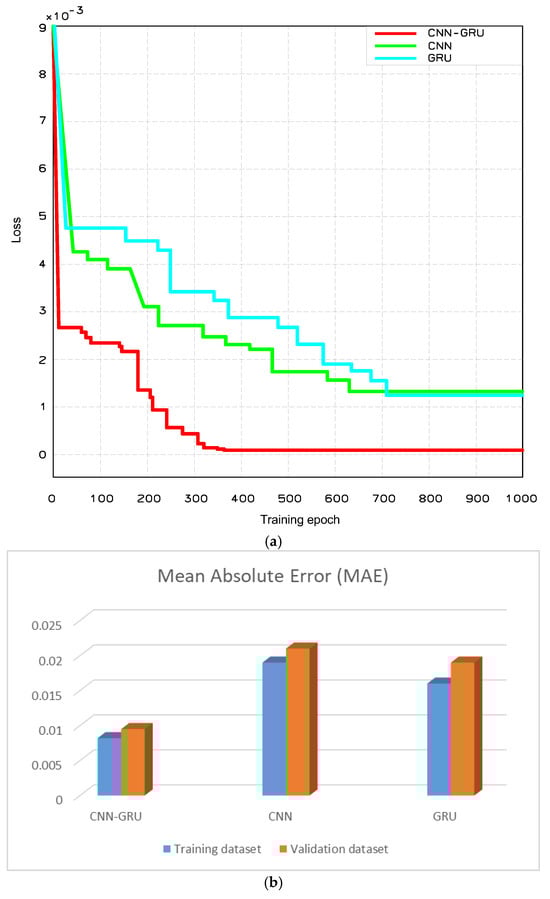 Figure 7a illustrates the fluctuation of the loss function during the training of three models: CNN-GRU, CNN, and GRU. In the early stages of training, all three models show a significant reduction in the loss value. However, as they progress into subsequent epochs, the differences between the models become increasingly evident. The CNN-GRU model stands out with the best performance, achieving a loss value that approaches nearly zero. CNN-GRU maintains the lowest loss value throughout the training process, demonstrating its superior ability to capture data features compared to the individual GRU and CNN models, which exhibit higher loss values. Additionally, CNN-GRU converges faster and reaches a stable state in just about 350 epochs, while the other two models take more than 700 epochs to achieve similar stability. These results indicate that combining CNN and GRU can perform significantly better than independent neural networks.
